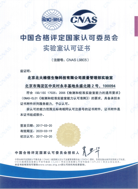 2017年3月20日,北大维信公司质量管理部实验室通过CNAS初次评审,获得认可证书。该工作于2015年9月22日启动, 2016年8月5日提交申请, 2017年1月8日通过现场评审。